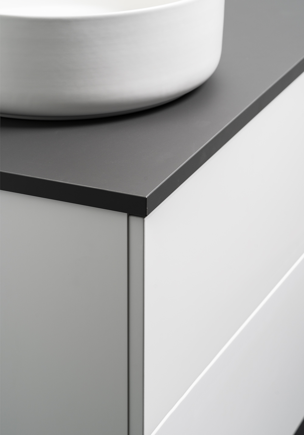 OnTop bänkskivor av laminat. Antracit har en extra matt yta som motverkar fingeravtryck. Håltagning utförs av installatören beroende på blandare, handfatsmodell och och val av placering.