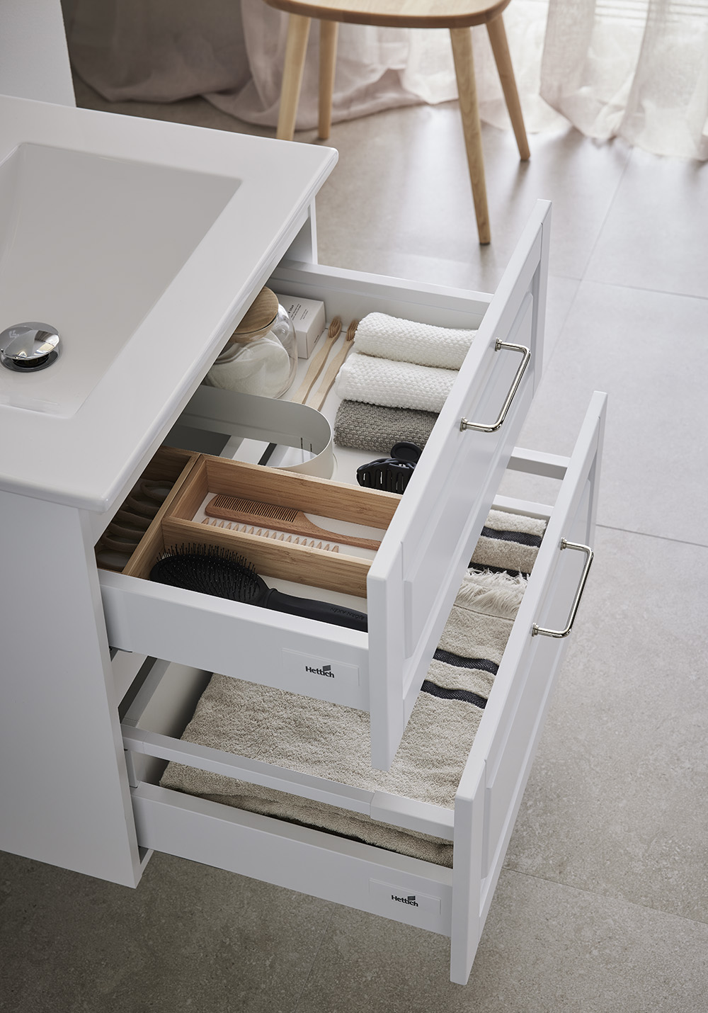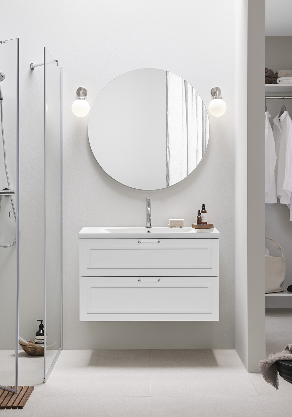 Hafa Grace är badrumsmöbler med vackert profilerade fronter utformade för att passa i såväl ett lantligt som ett modernt badrum i skandinavisk stil. Mjukstängande lådor med fullutdrag ger bra överblick över innehållet. Lådmattor och lådinredning av bambu hjälper till att hålla ordning. Badrumsskåpet är färdigmonterat och enkelt att installera med justerbara upphängningsbeslag och utrymme förberett för både vägg- och golvavlopp. Grace tvättställsskåp finns i tre matta kulörer - vitt, grått och antracit. Köp till handtag eller knopp som passar din stil och komplettera med fristående handfat på en bänkskiva eller nedsänkt tvättställ i porslin samt vattenlås.