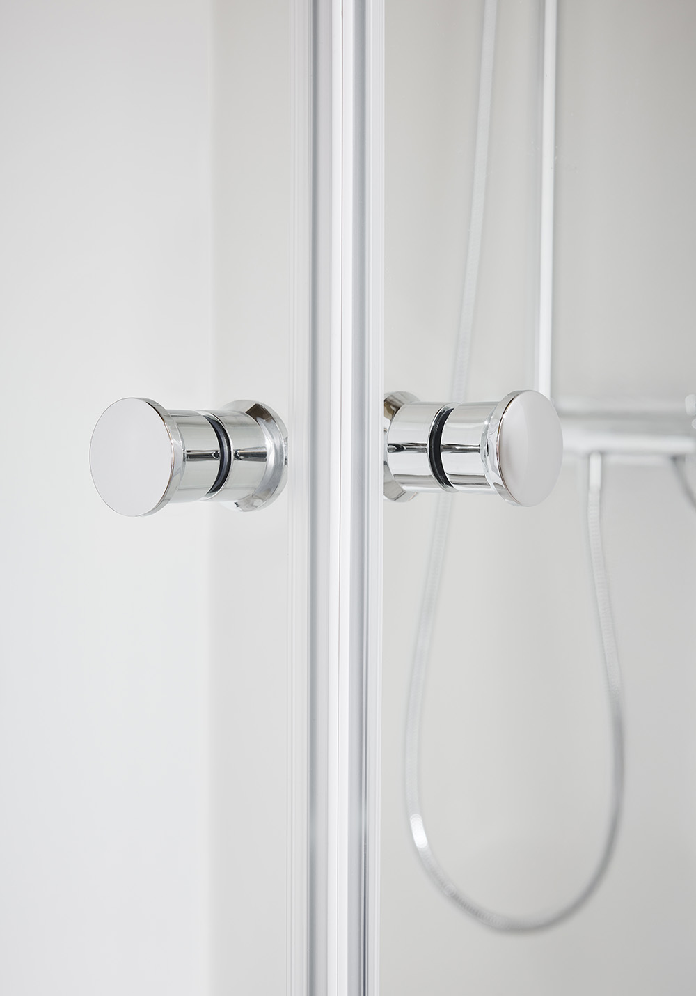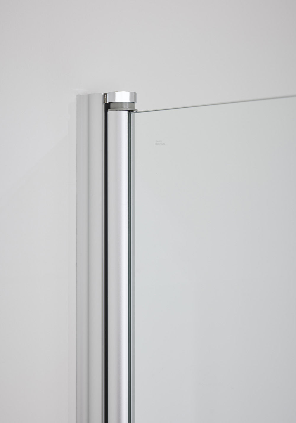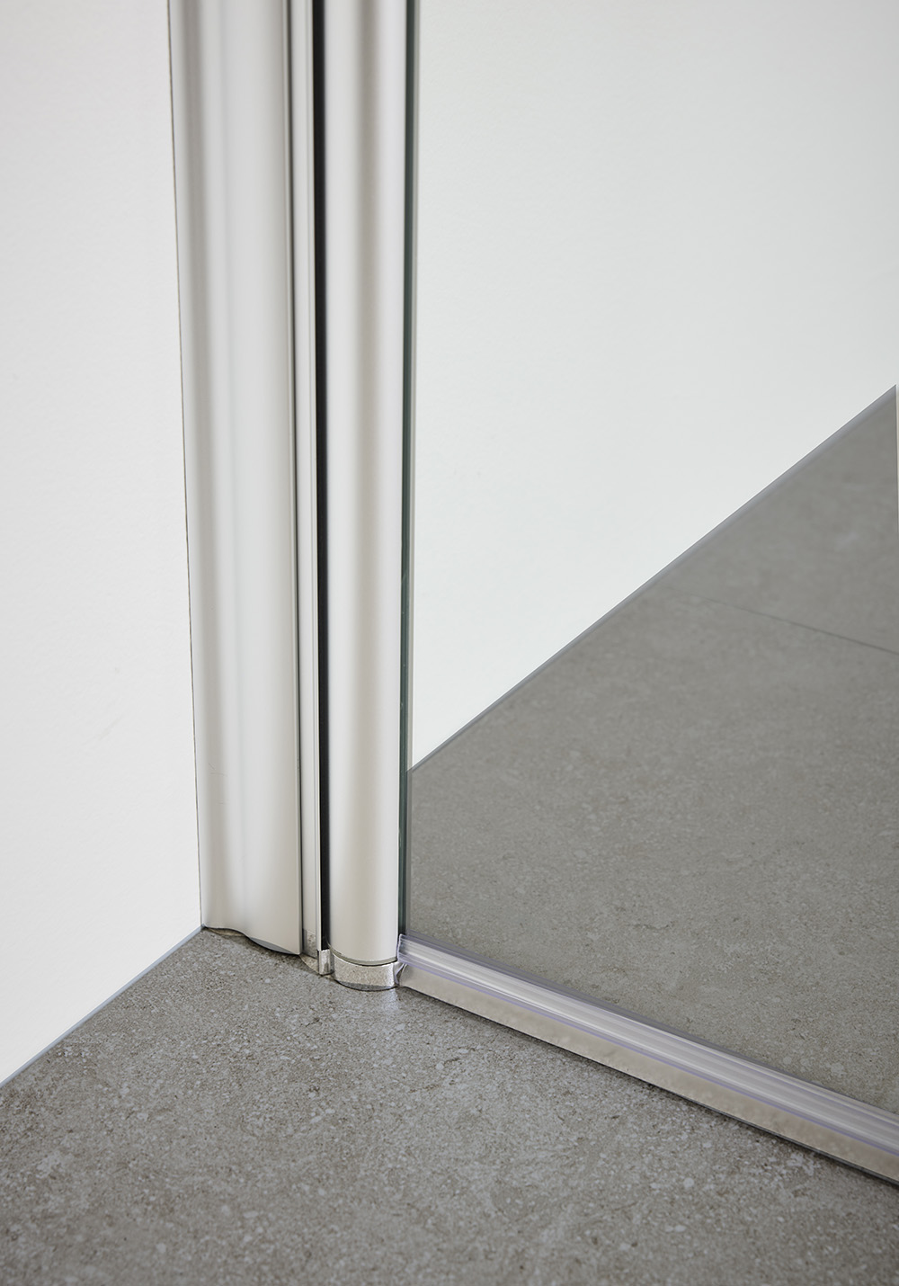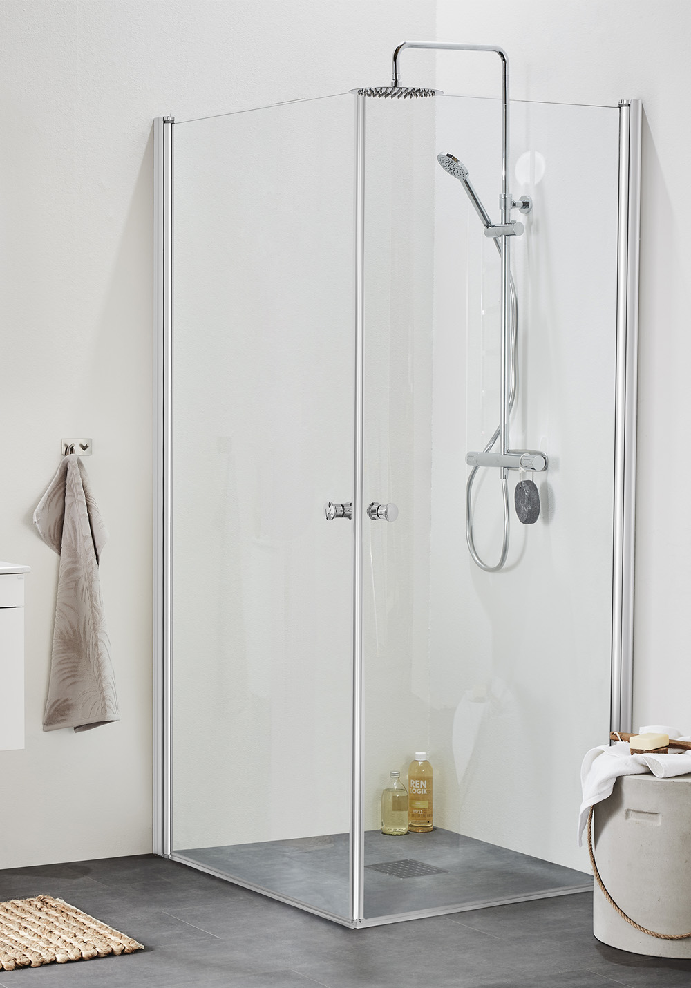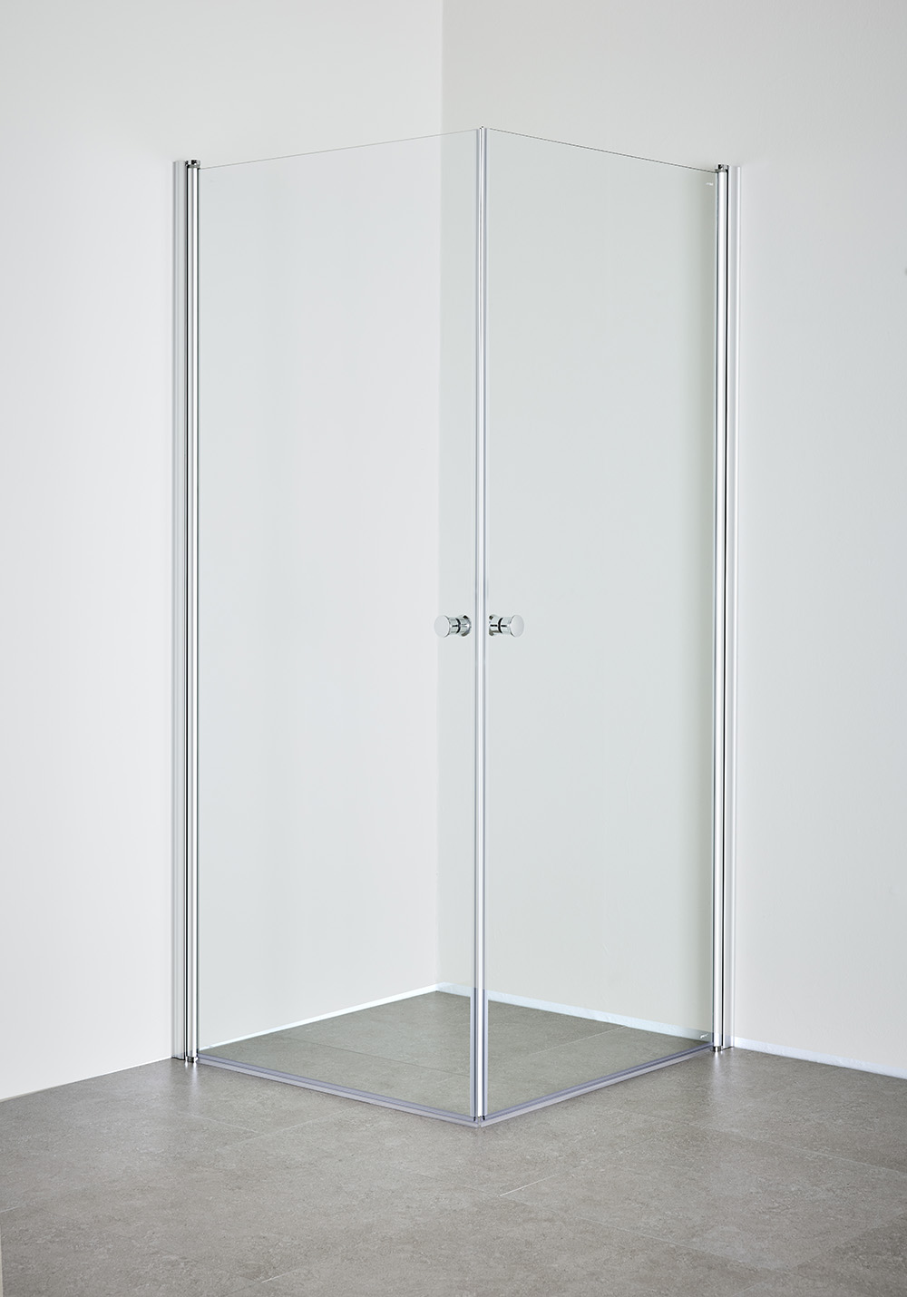 Rymligt duschhörn med raka dörrar i klart glas med stabila väggprofiler i eloxerad aluminium. Justerbar magnetstängning gör att dörrarna sluter helt tätt. Dörrarna är vändbara och har lyftgångjärn för att inte ta i golvet vid öppning. Höjd 1900 mm och med 5 mm härdat säkerhetsglas. Kan monteras med utanpåliggande rör, 35 mm. Släplist, magnetlist och knoppar ingår.