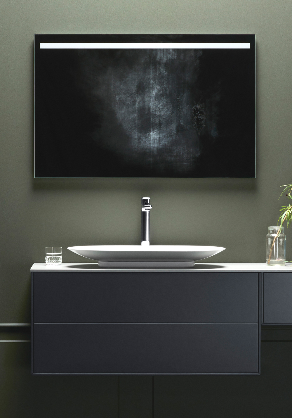 Spegel med integrerad LED-belysning med varmvitt behagligt ljus som lyser framåt genom frostat fält samt uppåt och nedåt. Upphängning med justeringsmöjlighet. IP24.