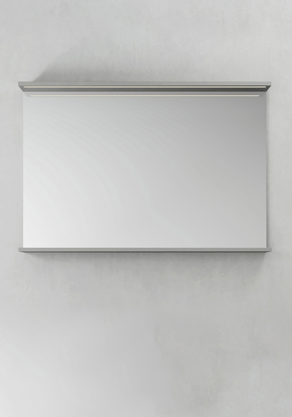 Spegel med funktionell belysning med infälld LED-profil eller LED-spots med varmvitt ljus. Praktisk hylla för avställning. Enkel installation för en person med justerbara upphängningsbeslag. Förberett för enkel el-installation. IP24.
