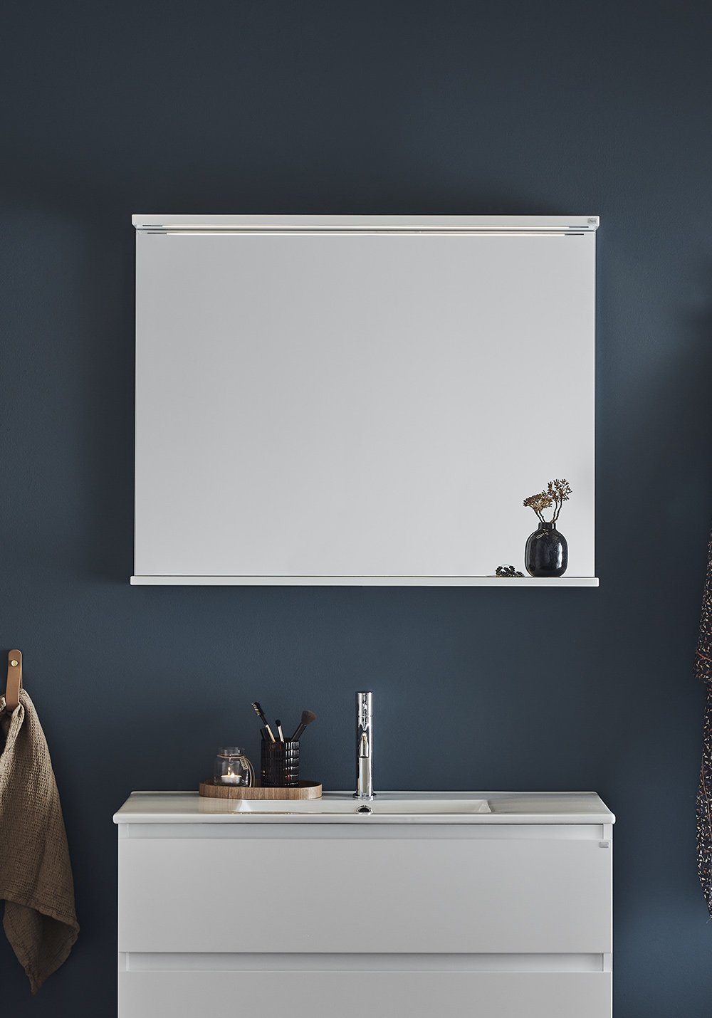 Spegel med funktionell belysning med infälld LED-profil i varmvitt ljus. Praktisk hylla för avställning. Enkel installation för en person med justerbara upphängningsbeslag. Förberett för enkel el-installation. IP24