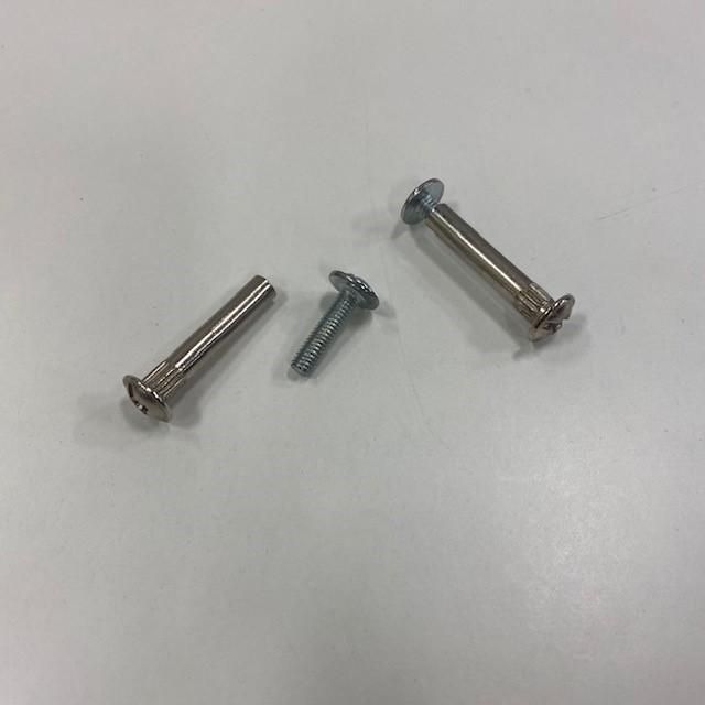Förbindelseskruv till underskåp och spegelskåp. Används för att montera ihop 2st 60 skåp, med 16mm tjockt sidostycke. Genomföring 5mm Ø. Säljs parvis.