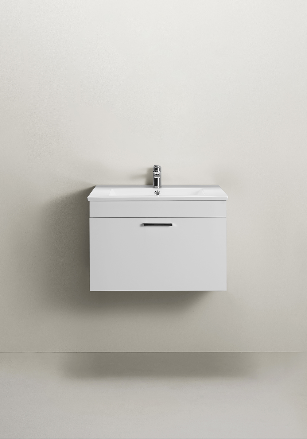 Tvättställsskåp med matt lack i vitt och svart eller i vit högblank med mjukstängande låda som ger generös förvaring. Tvättställsskåpet är enkelt att installera för en person med skena på vägg. Förberett för både vägg- och golvavlopp i bakkant för enkel montering. Justerbara upphängningsbeslag. Komplettera med nedsänkt handfat och PUM-vattenlås för kommod, 126 56 00. Sätt din personliga stil på ditt badrumsskåp med ett av våra handtag eller knoppar.