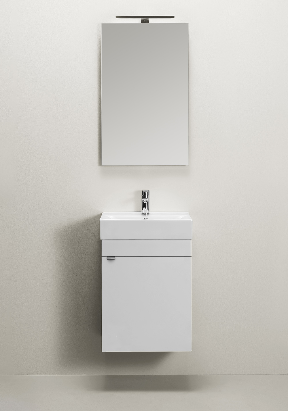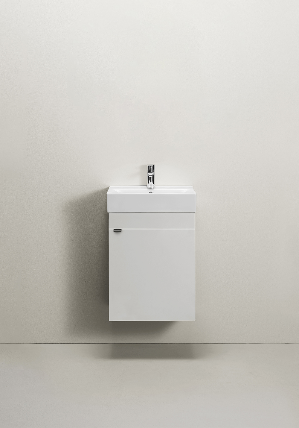 Tvättställsskåp i sammetsmatt lack i svart eller vitt med mjukstängande lucka som ger generös förvaring. Tvättställsskåpet är enkelt att installera för en person med skena på vägg. Inuti skåpet finns ett hyllplan, flyttbart i höjdled. Badrumsskåpet är förberett för både vägg- och golvavlopp i bakkant för enkel montering. Justerbara upphängningsbeslag. Komplettera med tvättställ och det vattenlås som passar din lösning av badrumsskåp. Sätt din personliga stil med ett av våra handtag eller knoppar.