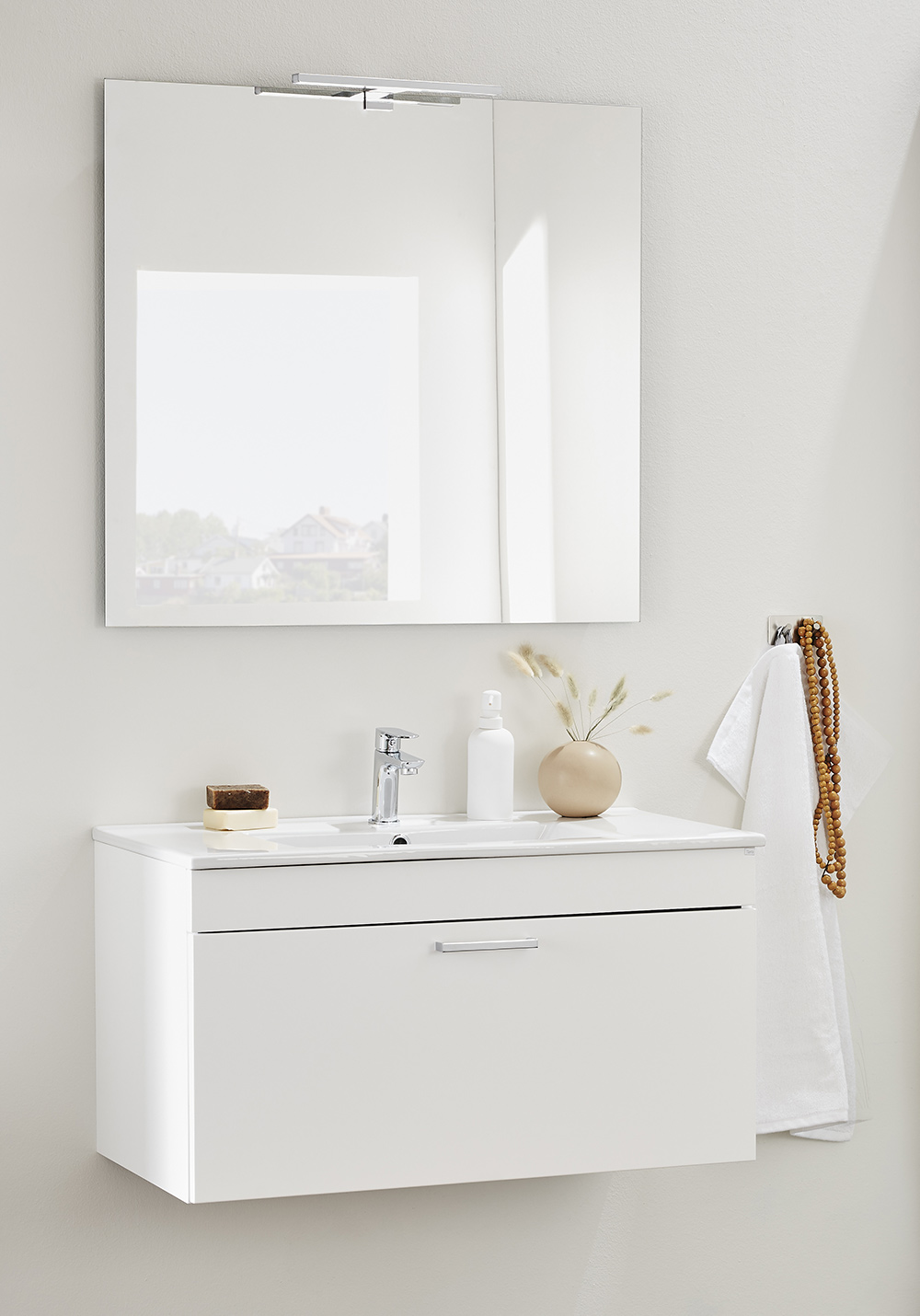 Tvättställsskåp med mjukstängande låda som ger generös förvaring. Komplettera med nedsänkt handfat och PUM-vattenlås för kommod, 126 56 00 samt ett av våra handtag eller knoppar.