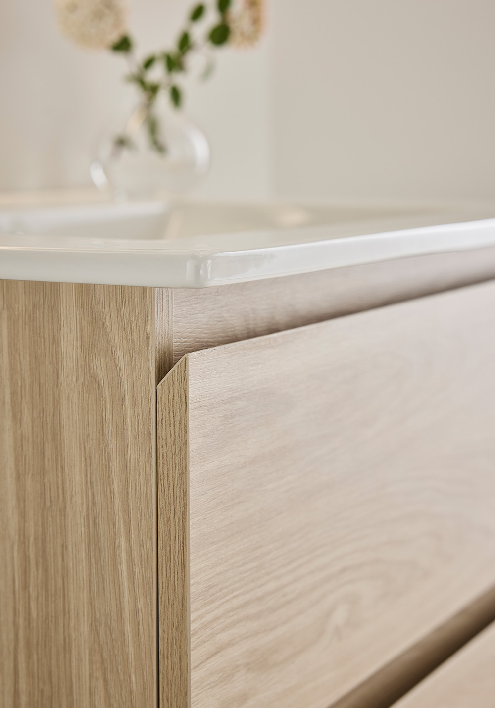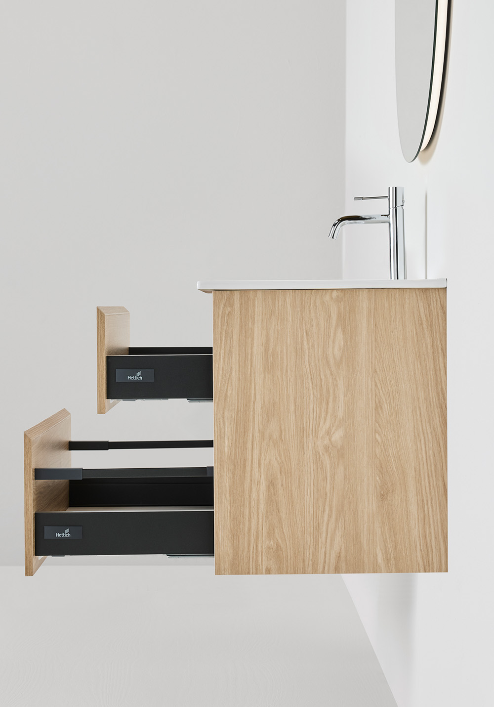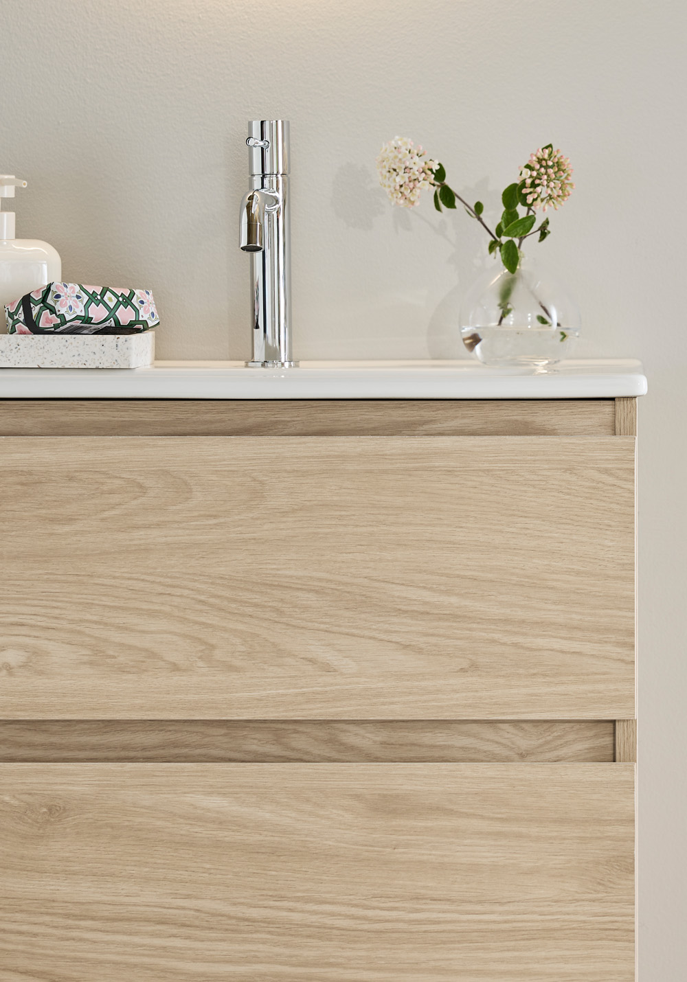 Hafa Style tvättställsskåp finns i bredder 600, 800, 1000 och 1200 och i färgerna vit matt samt vackert mönstrad yta av ek eller brun ek. Badrumsskåpet är enkelt att installera, med hel väggskena och justerbara upphängningsbeslag. Det är dessutom förberett för både vägg- och golvavlopp.