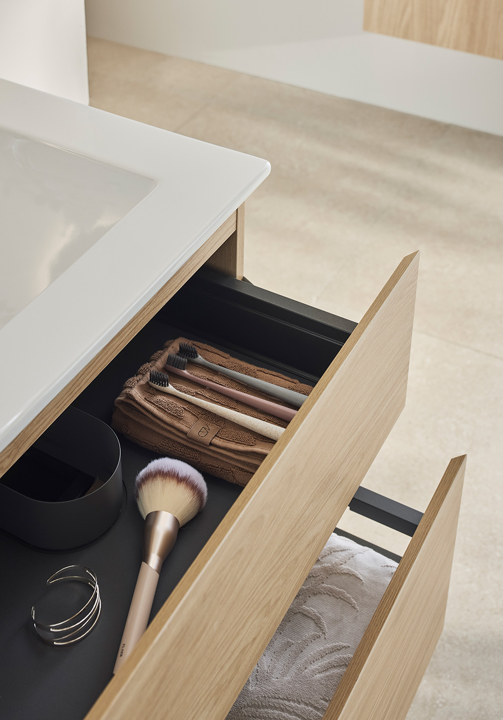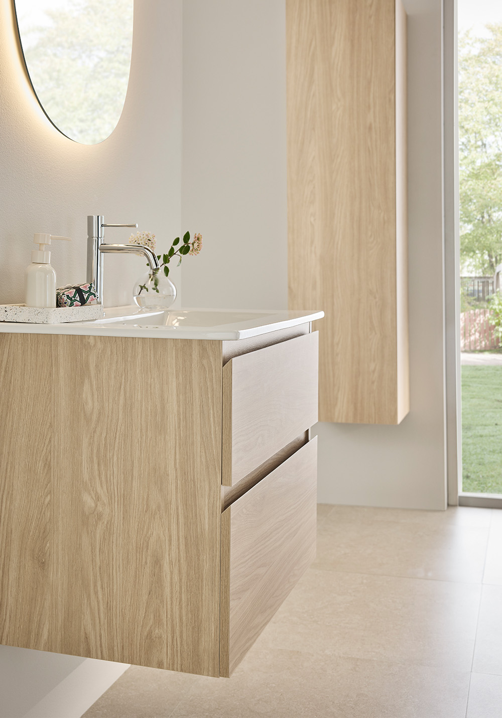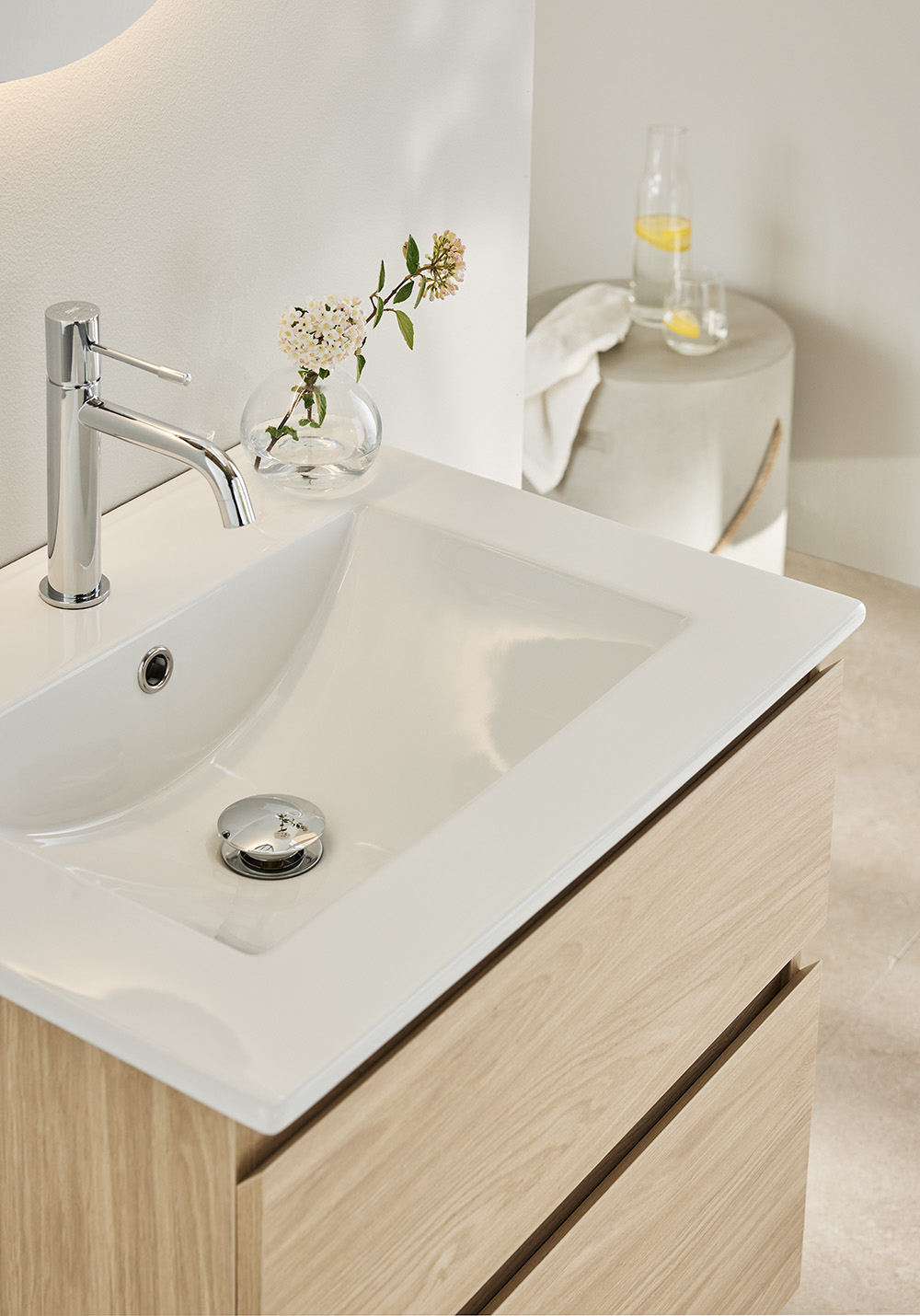 Hafa Style tvättställsskåp finns i bredder 600, 800, 1000 och 1200 och i färgerna vit matt samt vackert mönstrad yta av ek eller brun ek. Badrumsskåpet är enkelt att installera, med hel väggskena och justerbara upphängningsbeslag. Det är dessutom förberett för både vägg- och golvavlopp.