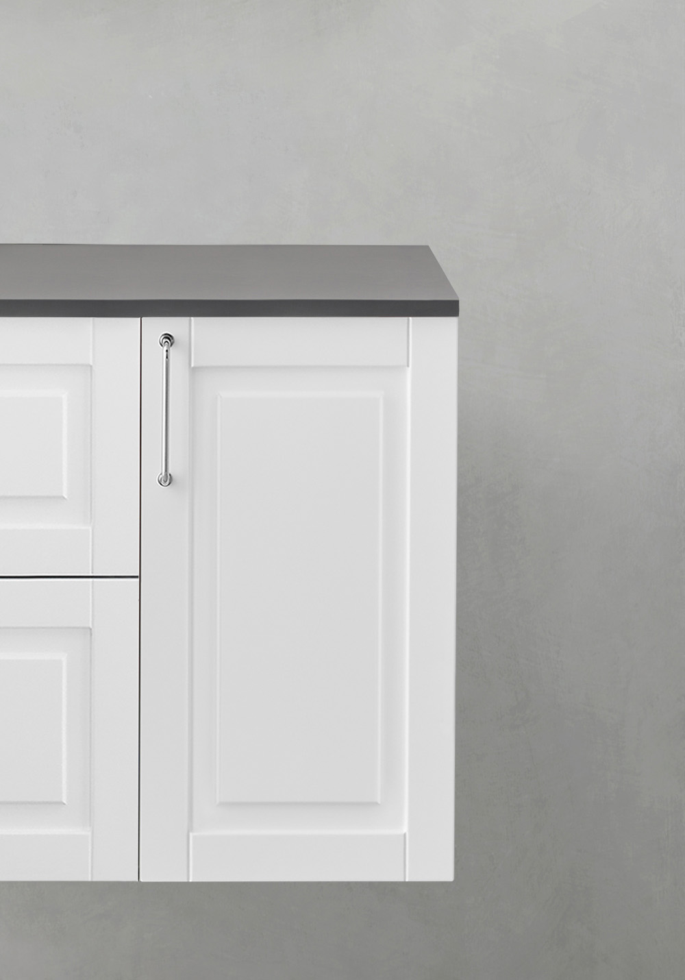 Hafa Grace är badrumsmöbler med vackert profilerade fronter utformade för att passa i såväl ett lantligt som ett modernt badrum i skandinavisk stil. Komplettera ditt tvättställskåp med Hafa Grace sidomudul för ytterligare bredd eller annan lösning. Välj mellan mjukstängande lucka som kompletteras med handtag eller en lucka som öppnas med push-open. Inuti skåpet finns en flyttbar hylla. Modulen och modulens luckan kan monteras på höger eller vänster sida. Grace badrumsmöbler finns i två matta kulörer - vitt och antracit