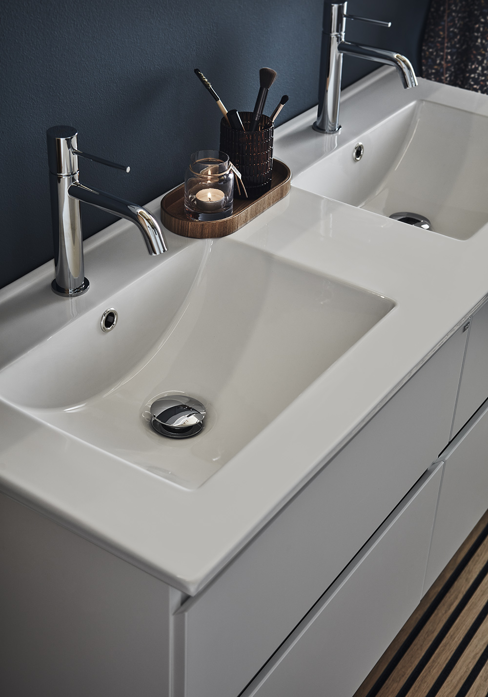 Hafa Style tvättställsskåp finns i bredder 600, 800, 1000 och 1200 och i färgerna vit matt samt vackert mönstrad yta av ek eller brun ek. Badrumsskåpet är enkelt att installera, med hel väggskena och justerbara upphängningsbeslag. Det är dessutom förberett för både vägg- och golvavlopp.