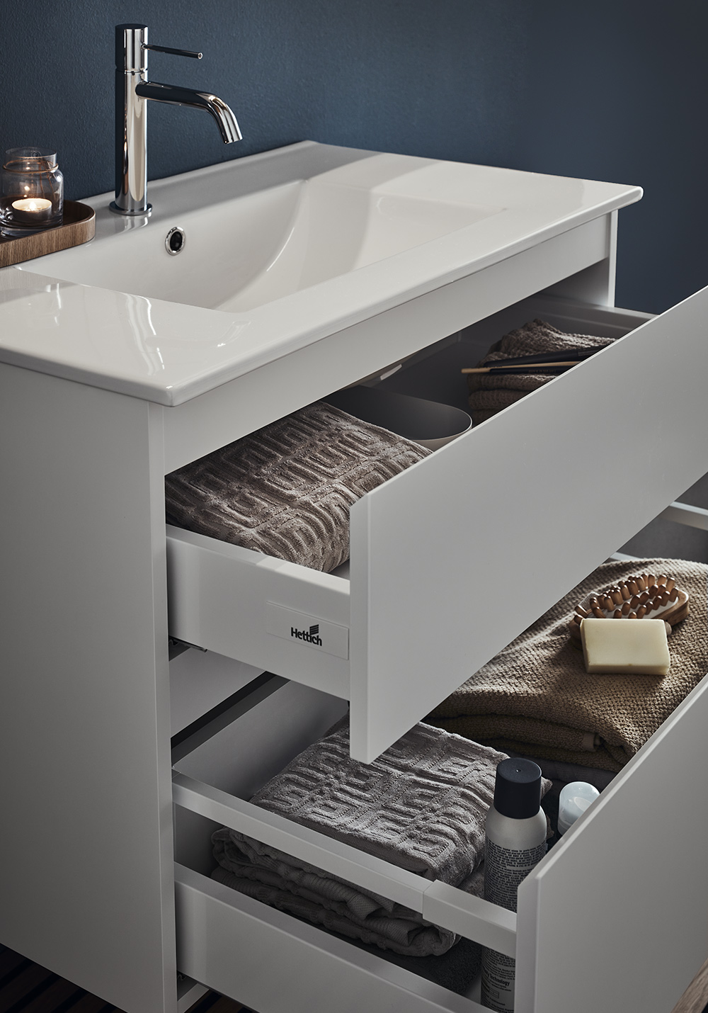 Tvättställsskåp Hafa Style med tvättställ har integrerat grepp, vilket ger möbeln en stilren och modern look. Tvättstället har en stor ho och kommodens två mjukstängande lådor har lådmattor och fullutdrag, så du kan enkelt nå allt som finns i dem. Köp till blandare, bottenventil, vattenlås, eluttag.