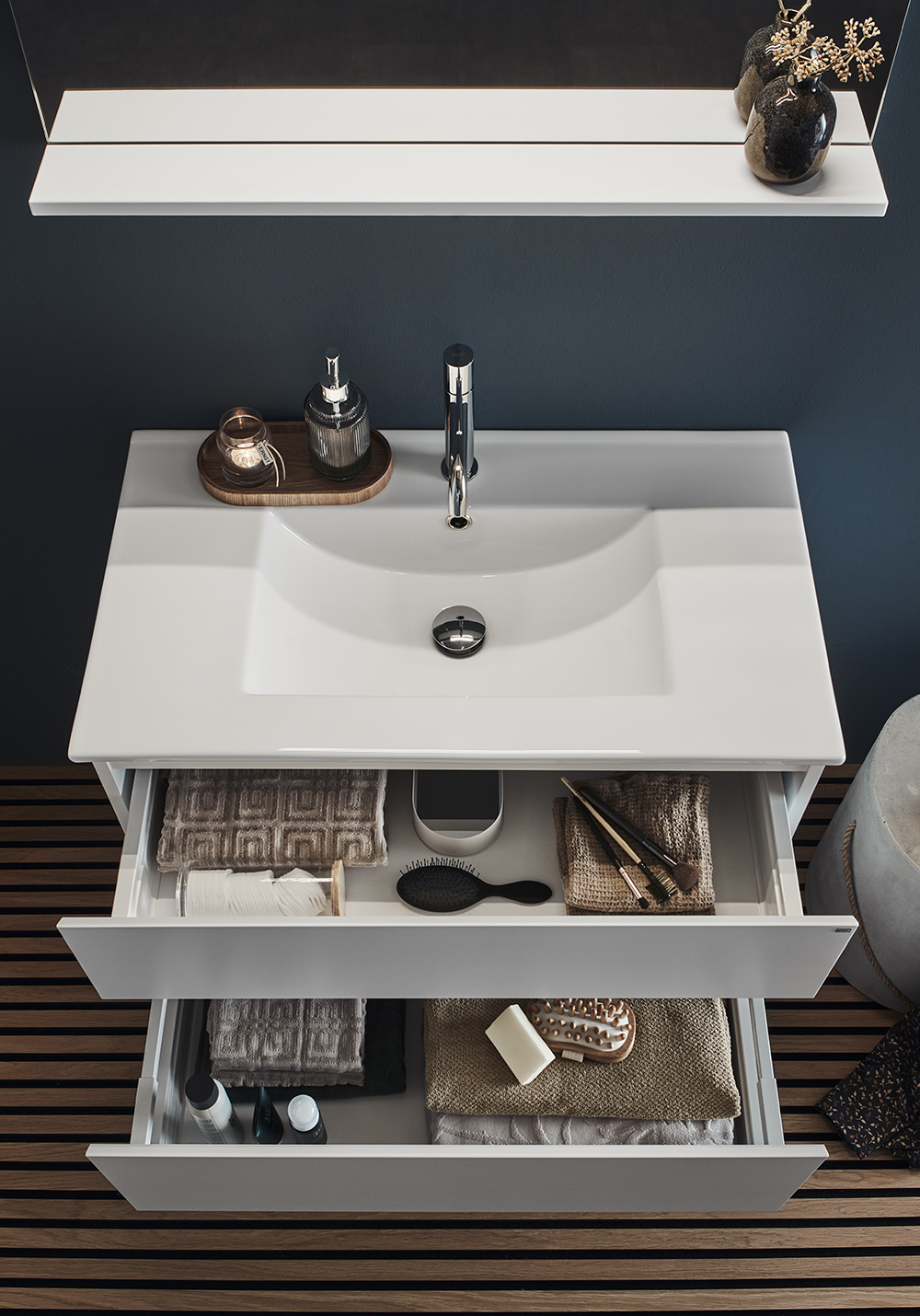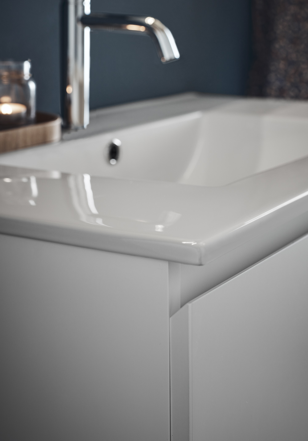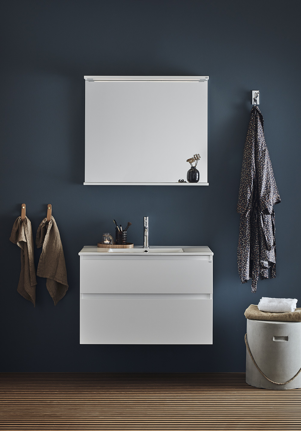 Hafa Style tvättställsskåp finns i bredder 600, 800, 1000 och 1200 och i färgerna vit matt samt vackert mönstrad yta av ek eller brun ek. Badrumsskåpet är enkelt att installera, med hel väggskena och justerbara upphängningsbeslag. Det är dessutom förberett för både vägg- och golvavlopp.