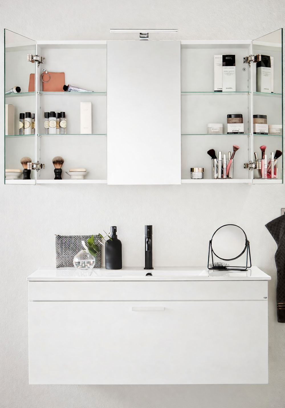 Hafa Go spegelskåp är ett praktiskt skåp med gott om plats för förvaring. Med dubbelsidiga spegeldörrar och glashyllor inuti som kan flyttas i höjdled. Spegelskåpet monteras enkelt upp på skena på vägg, vilket gör det enkelt att installera för en person. Med justerbara upphängningsbeslag. Finns i flera bredder och färger. Köp till Go LED-lampa 1267270 och eluttag 1267265.
