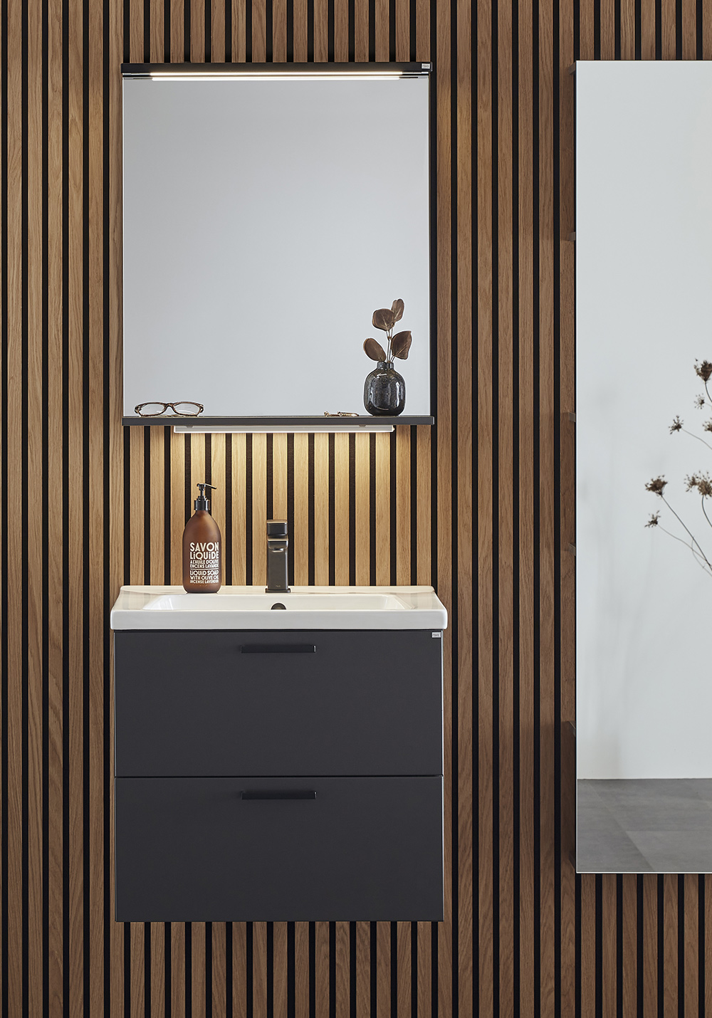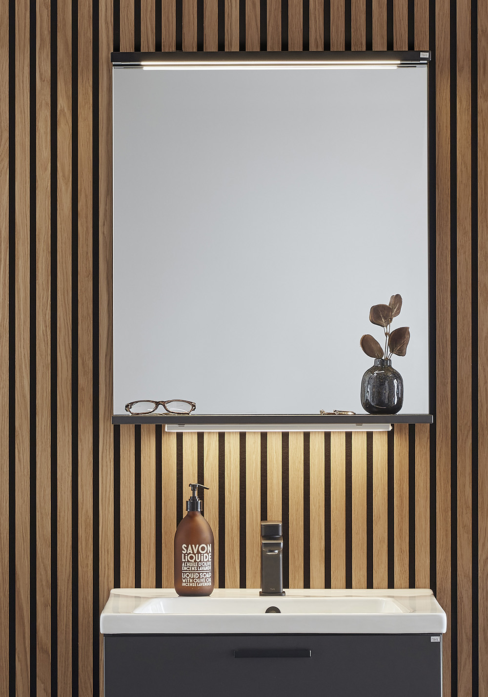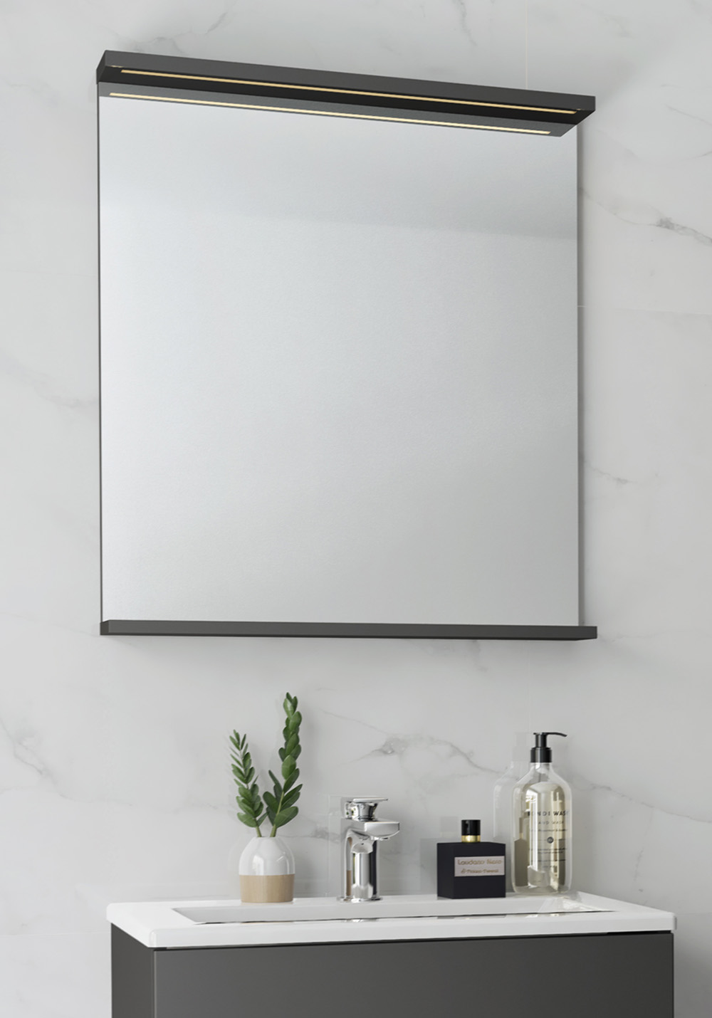 Spegel med funktionell belysning med infälld LED-profil eller LED-spots med varmvitt ljus. Praktisk hylla för avställning. Enkel installation för en person med justerbara upphängningsbeslag. Förberett för enkel el-installation. IP24