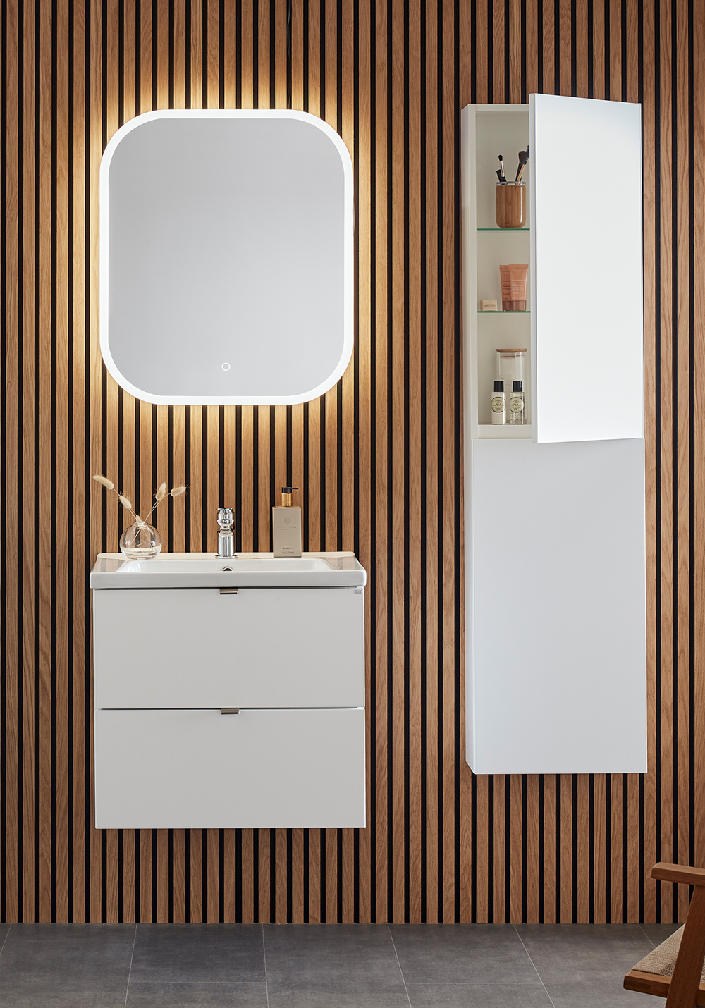 Mjukt rundad spegel med dimbar belysning runt om. Dekorativ och funktionell LED-belysning med varmvitt ljus som styrs med touchfunktion. Spegeln minns den senaste ljusinställningen vid av/på. IP44.