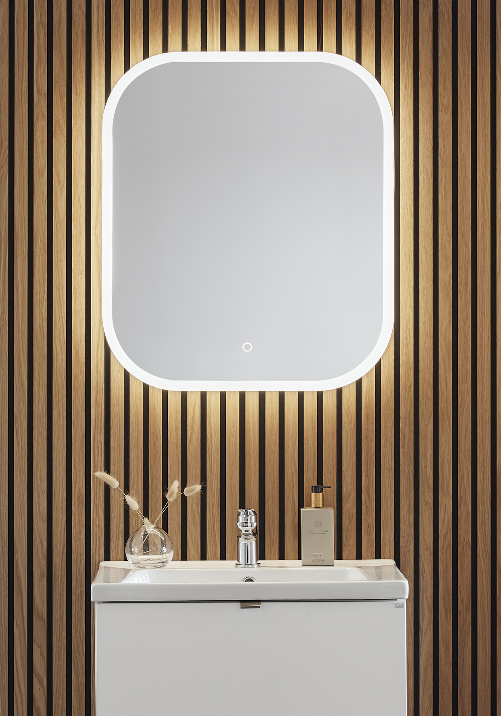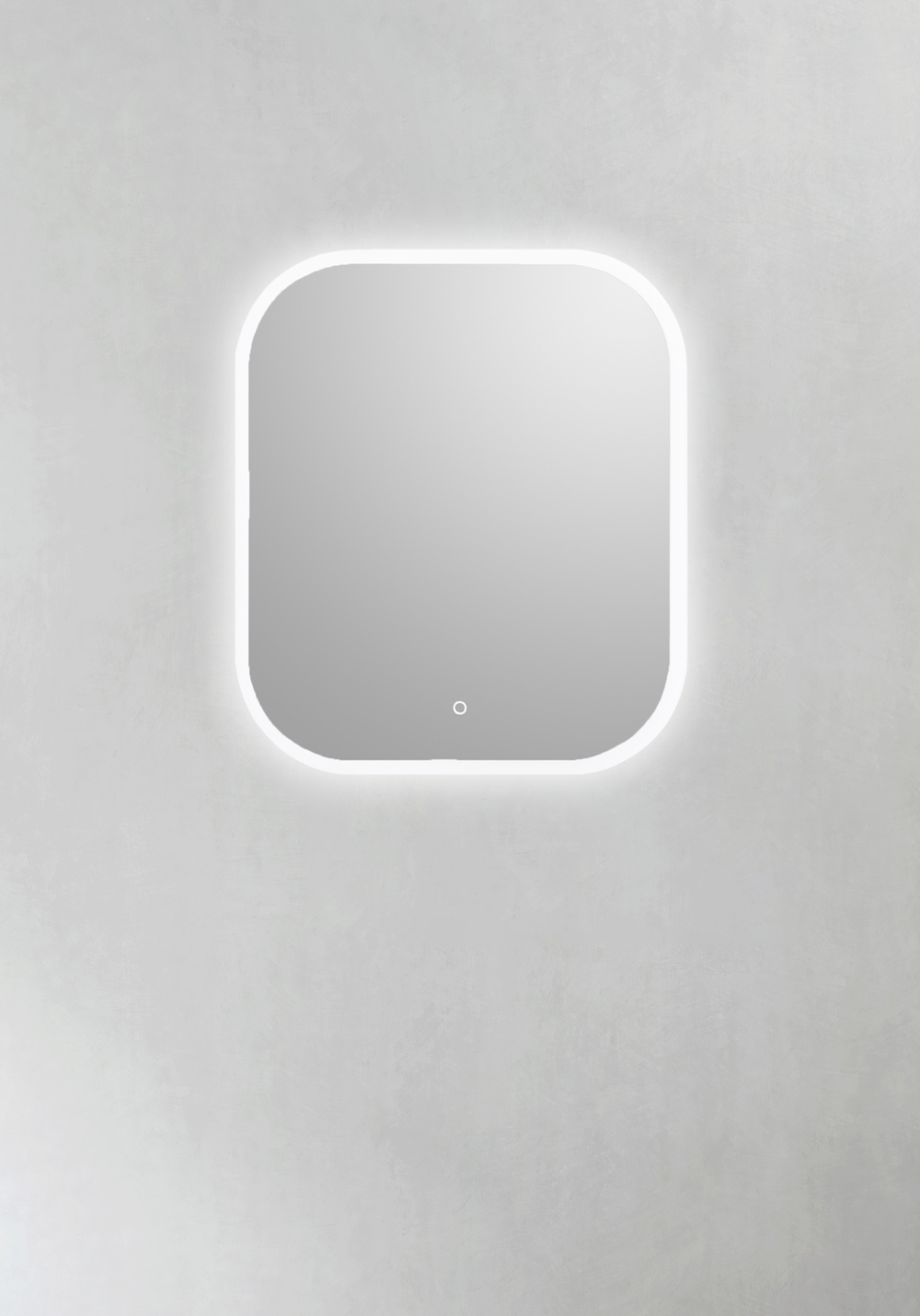 Spegel med mjukt rundade hörn med dekorativ och funktionell dimbar LED-belysning med varmvitt ljus runt om 3000K. Touchfunktion med minne som kommer ihåg senast inställning vid av/på. IP44.
