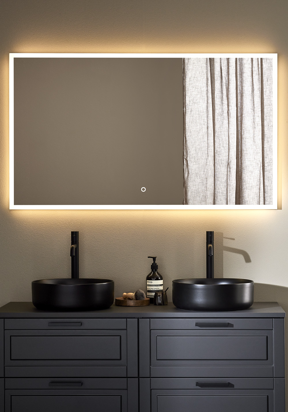 Stilren, rektangulär spegel med dekorativ och funktionell dimbar LED-belysning med varmvitt ljus runt om 3000K. Touchfunktion med minne som kommer ihåg senast inställning vid av/på. IP44.