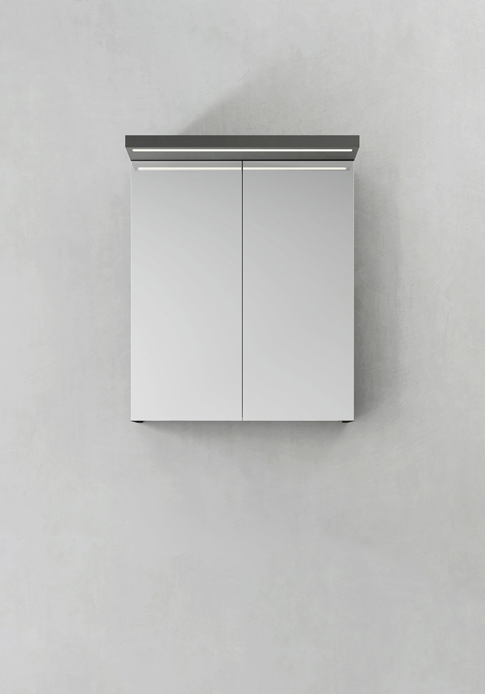 Spegelskåp med funktionell belysning med infälld LED-profil eller LED-spots i varmvitt ljus. Mjukstängande, dubbelsidiga spegeldörrar. Eluttag inuti skåpet på höger sida och med flyttbara hyllplan i glas med hyllbärare som låser dem säkert på plats. Enkel installation för en person med hel upphängningsskena och justerbara upphängningsbeslag. Förberett för enkel el-installation. IP44.