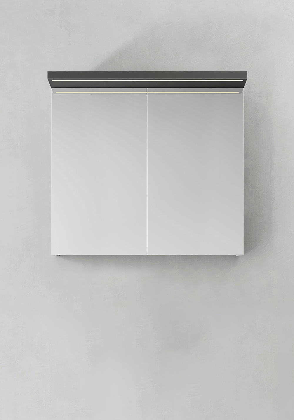 Spegelskåp med funktionell belysning med infälld LED-profil eller LED-spots i varmvitt ljus. Mjukstängande, dubbelsidiga spegeldörrar. Eluttag inuti skåpet på höger sida och med flyttbara hyllplan i glas med hyllbärare som låser dem säkert på plats. Enkel installation för en person med hel upphängningsskena och justerbara upphängningsbeslag. Förberett för enkel el-installation. IP44.