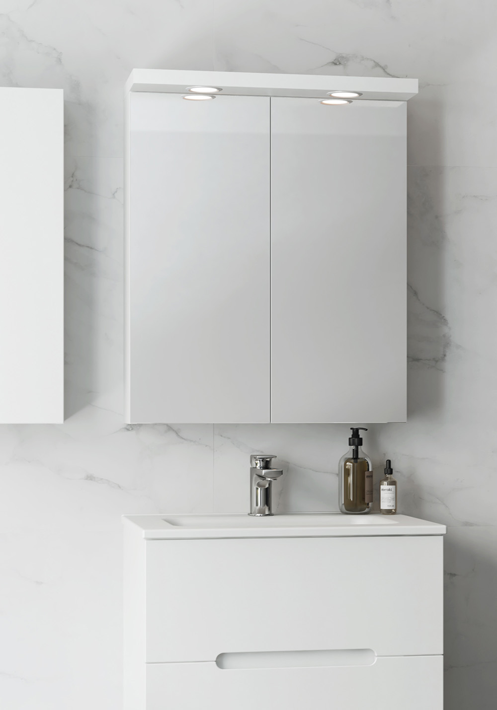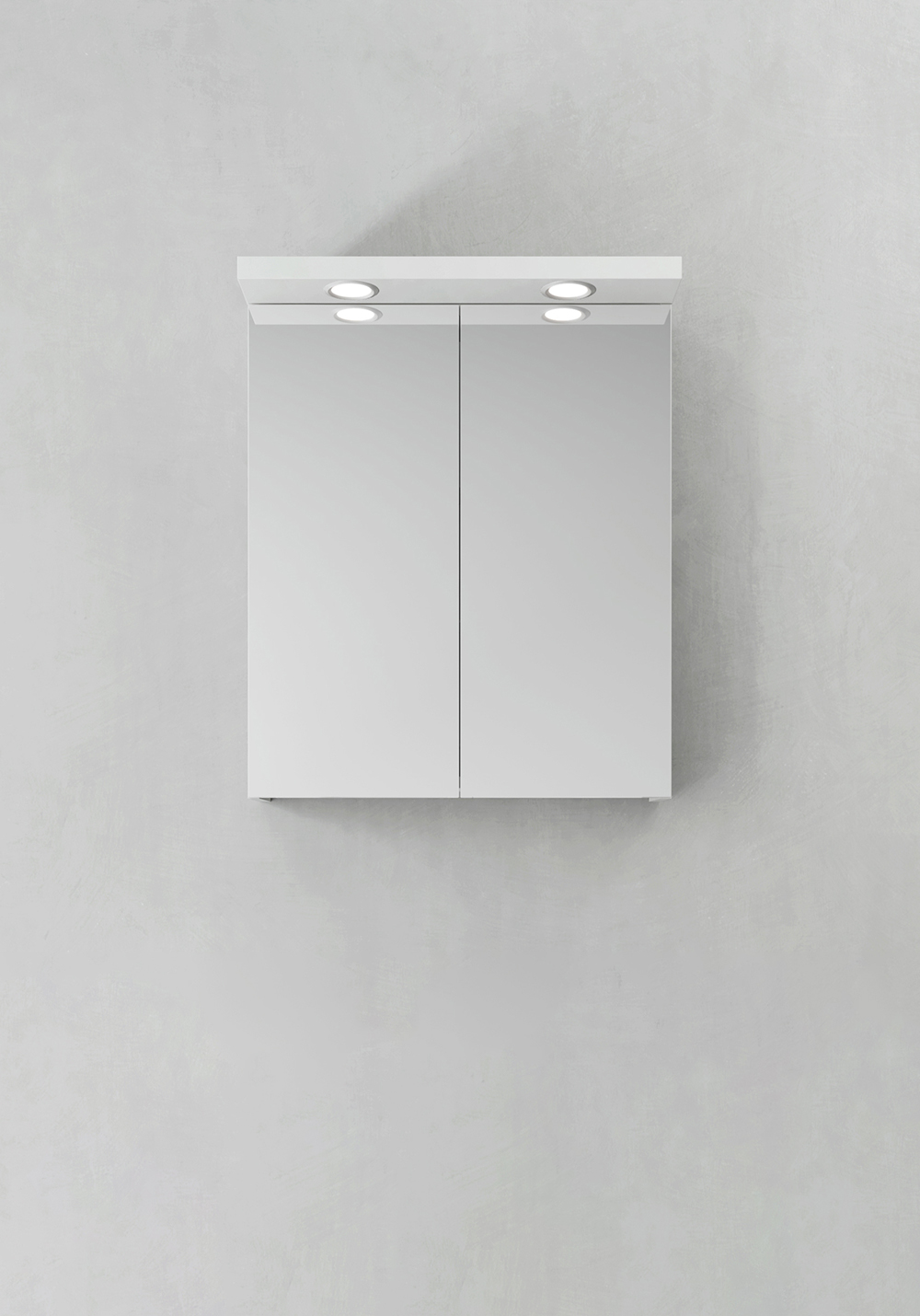 Spegelskåp med funktionell belysning med infälld LED-profil eller LED-spots i varmvitt ljus. Mjukstängande, dubbelsidiga spegeldörrar. Eluttag inuti skåpet på höger sida och med flyttbara hyllplan i glas med hyllbärare som låser dem säkert på plats. Enkel installation för en person med hel upphängningsskena och justerbara upphängningsbeslag. Förberett för enkel el-installation. IP44.