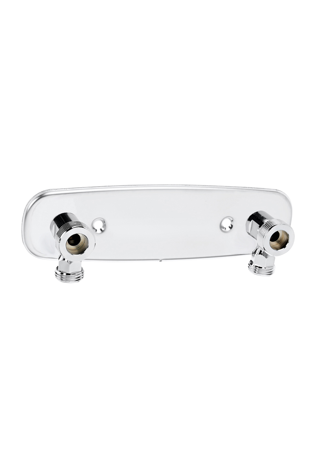 Rostfritt, blankpolerat blandarfäste med vridbara anslutningsvinklar. För utanpåliggande rördragning.
