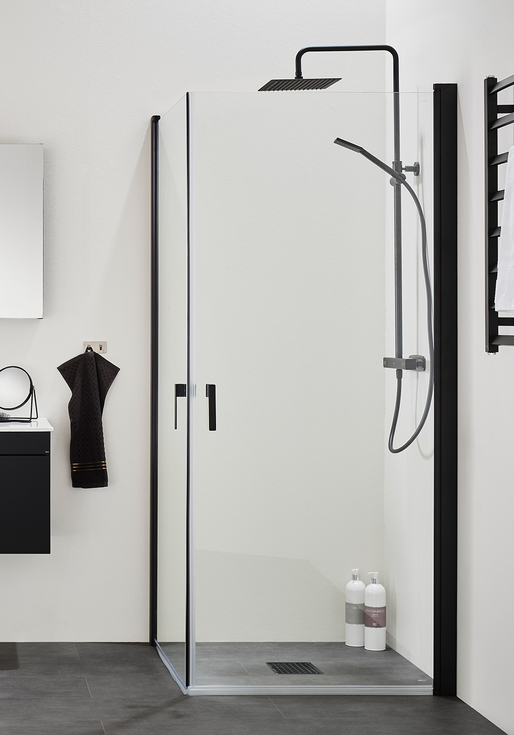 Rymligt duschhörn med raka dörrar i klart glas och profiler och handtag i aluminium eller matt svart. När duschen inte används kan duschdörrarna vinklas in mot väggen vilket frigör plats i badrummet. Duschhörnet är stabilt med väggprofiler som kan monteras med skruv eller limbrickor. Det har en patenterad lösning för enkel installation och justering, Hafa's InstaQuick™. Dörrarna har lyftgångjärn för att den inte skall ta i golvet vid öppning och är vändbara så du kan välja hur de skall monteras. 6 mm härdat säkerhetsglas. Höjd 2000 mm. Kan monteras med utanpåliggande rör, 35 mm. 22 mm släplist, magnetlist och handtag ingår.