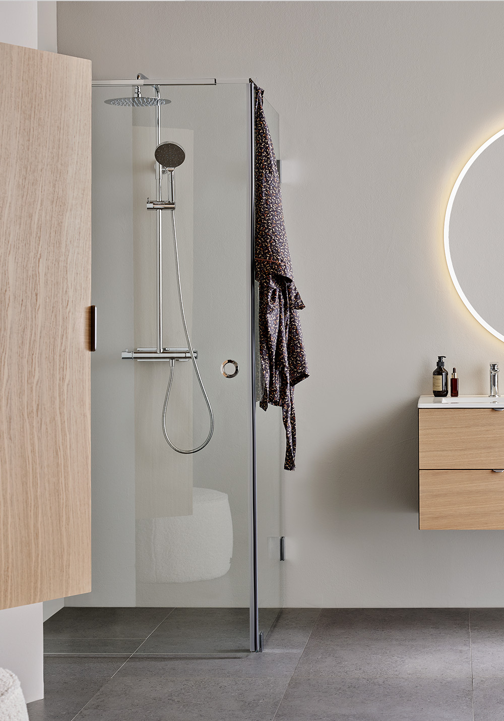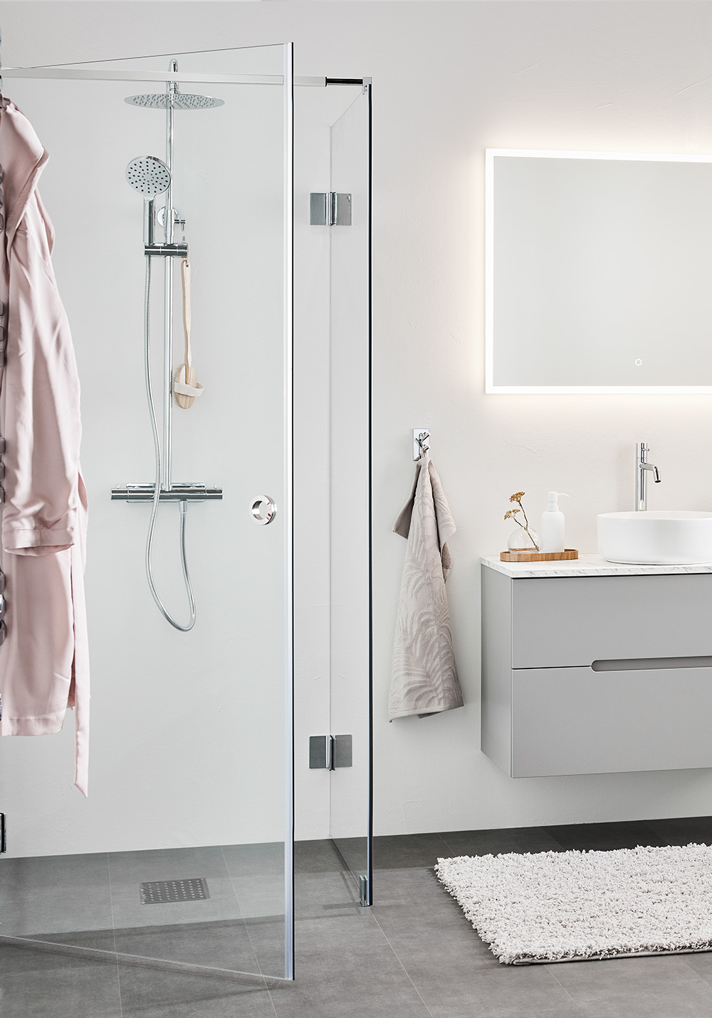 För att underlätta rengöringen av duschdörrar och duschväggar har duscharna stora släta ytor och profiler utan djupa skåror. Missfärgningar tas bort med citron eller vinsyra; skölj noga efteråt. Kalkfläckar tas bort med 50 grader varm hushållsättika: gnid in, låt verka, skölj bort. Upprepa om fläckarna är svåra. Fettfläckar tas bort med rödsprit. Använd inte rengöringsmedel som är etsande, syrahaltiga eller slipande eftersom det kan ge bestående skador på ytan.