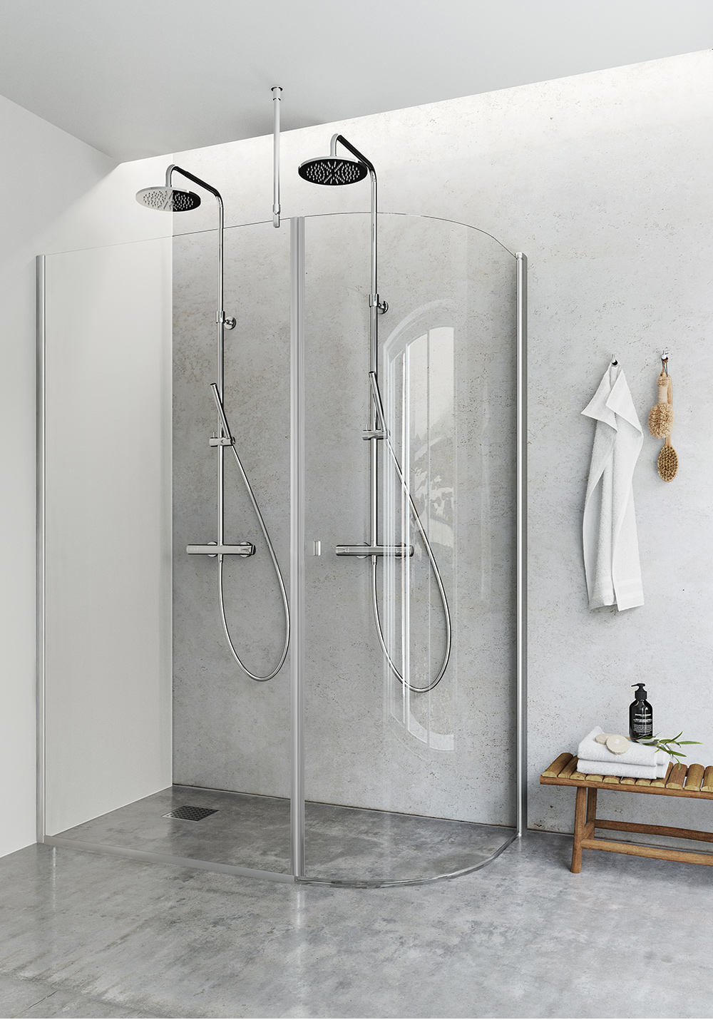 Stort duschhörn i J-formad design som ger plats för dubbla duschset. Duschhörnet består av en J-formad duschdörr och en fast, rak duschvägg, båda i klarglas. Duschhörnet är stabilt med väggprofiler i eloxerad aluminium som kan monteras med skruv eller limbrickor. Det har en patenterad lösning för enkel installation och justering, Hafa's InstaQuick™. Dörren har lyftgångjärn för att den inte skall ta i golvet vid öppning och är vändbar så du kan välja om den skall placeras till höger eller vänster. Duschstången kan monteras på tre sätt: mot vägg, mot tak eller i vinkel mot samma vägg som duschväggen monteras. Dörren har 6 mm härdat säkerhetsglas och kan monteras med utanpåliggande rör, 35 mm. Väggen har 8mm härdat säkerhetsglas och förlängningsprofil kan köpas till för utanpåliggande rördragning. Höjd 2000 mm. 22 mm släplist, magnetlist och handtag ingår.