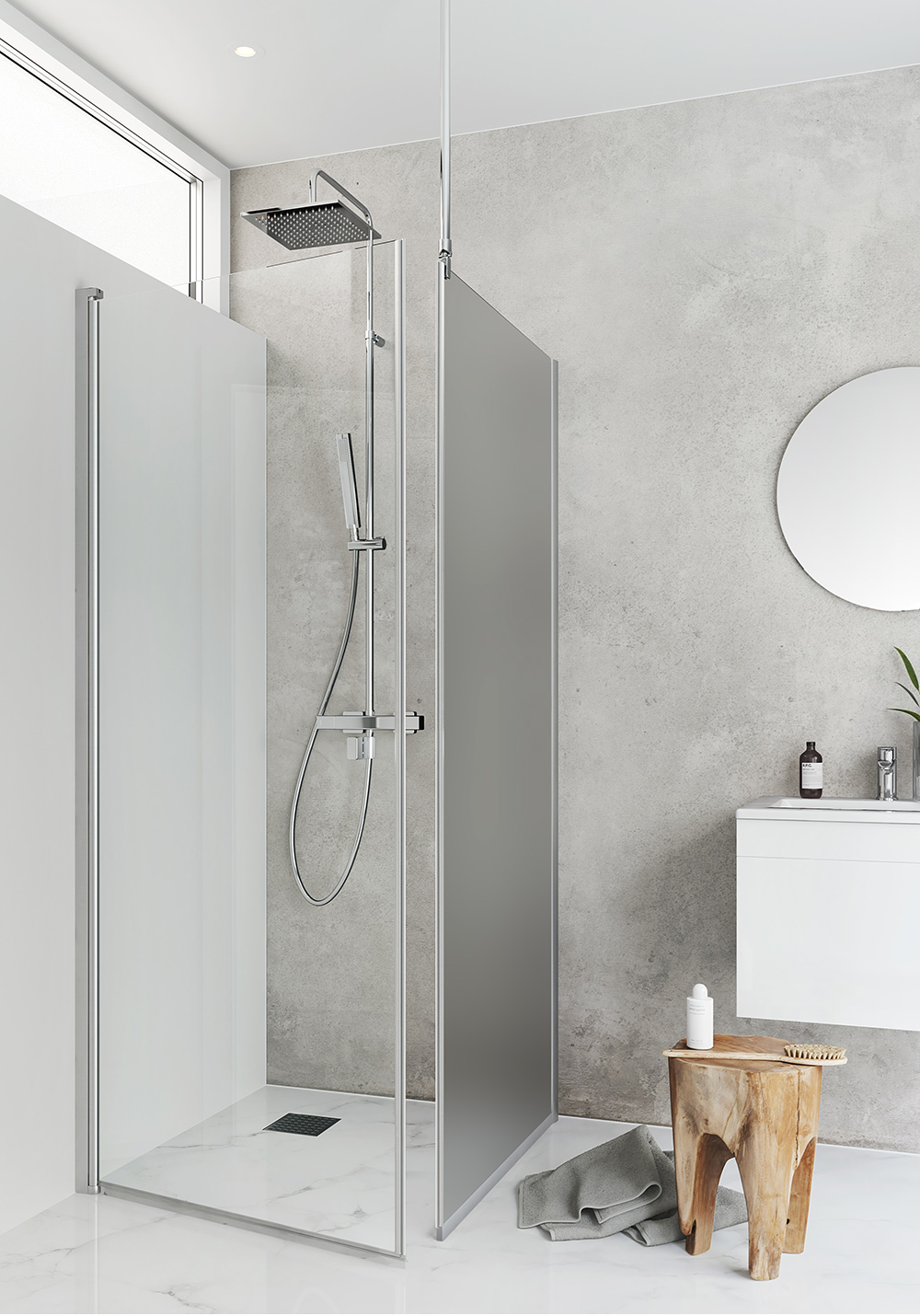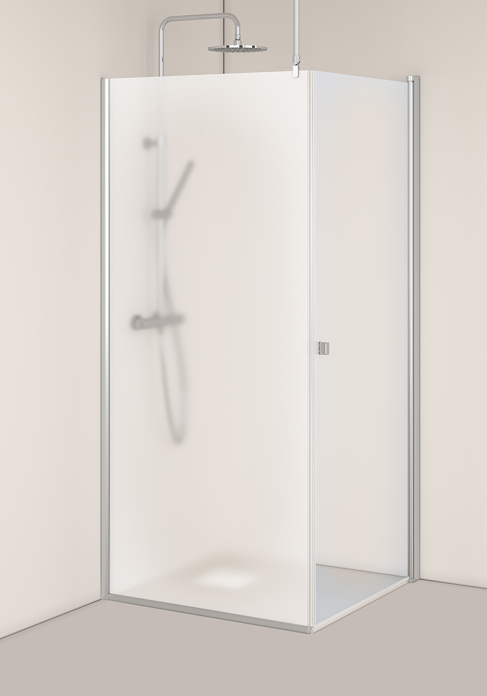 Rymligt duschhörn med en rak duschdörr i klart glas och en fast vägg i frostat glas. Duschhörnet är stabilt med väggprofiler i eloxerad aluminium som kan monteras med skruv eller limbrickor. Det har en patenterad lösning för enkel installation och justering, Hafa's InstaQuick™. Dörren har lyftgångjärn för att den inte skall ta i golvet vid öppning och är vändbar så du kan välja om den skall placeras till höger eller vänster. Duschstången kan monteras på tre sätt: mot vägg, mot tak eller i vinkel mot samma vägg som duschväggen monteras. Dörren har 6 mm härdat säkerhetsglas och kan monteras med utanpåliggande rör, 35 mm. Väggen har 8mm härdat säkerhetsglas och förlängningsprofil kan köpas till för utanpåliggande rördragning. Höjd 2000 mm. 22 mm släplist, magnetlist och handtag ingår.