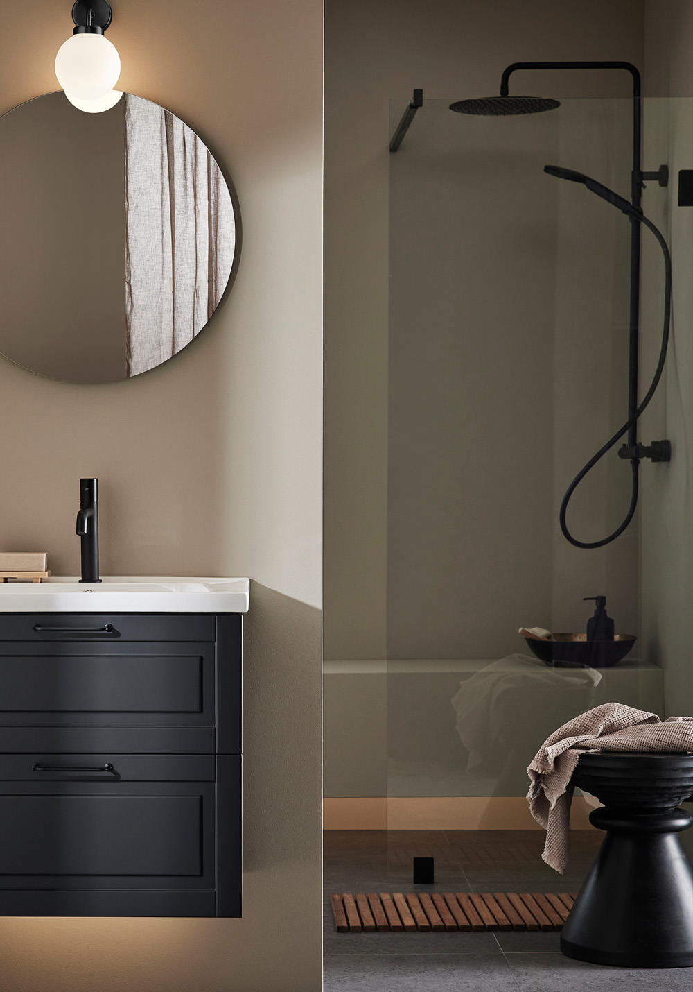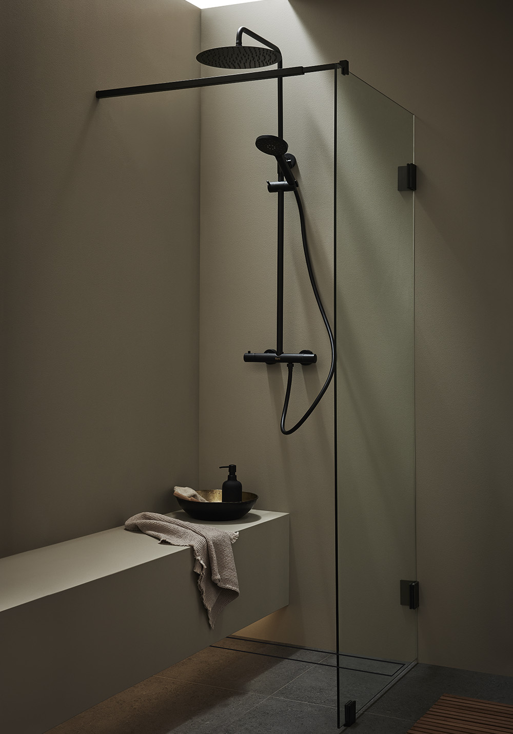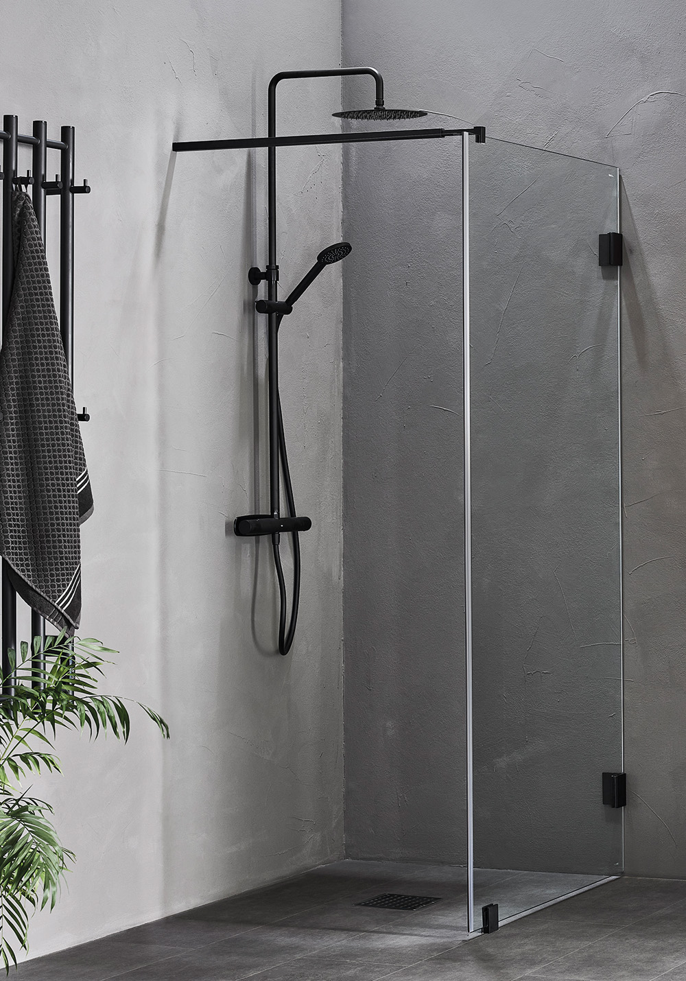 En exklusiv duschvägg med smäckra beslag och en elegant draperistång. Välj mellan tre färger, krom, matt svart eller borstad mässing. De stora glasytorna ger ett luftigt intryck och skapar en härlig rymd i badrummet. Väggen är vändbar så du kan välja vilken vägg den skall installeras på. Duschväggen kan kombineras med dörrar i Infinity-serien eller komplettera med ett vackert duschdraperi för att skapa en ombonad och lyxig dusch. Tänk på att Infinity saknar tätningslister som standard så ett korrekt golvfall blir extra viktig. 8 mm härdat säkerhetsglas. Magnetlist ingår. Fullhöjd 2000 mm och med 8 mm härdat klart säkerhetsglas.