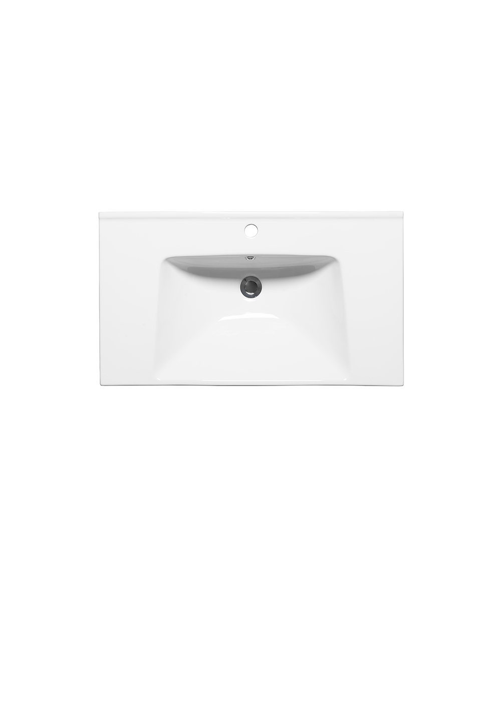 Modernt tvättställ i porslin med spänstig form som sträcker sig fram till kanten utvecklat av våra egna designers. Den unika formen harmonierar fint med tvättställsskåpets strikta linjer och på båda sidor finns det avställningsytor.