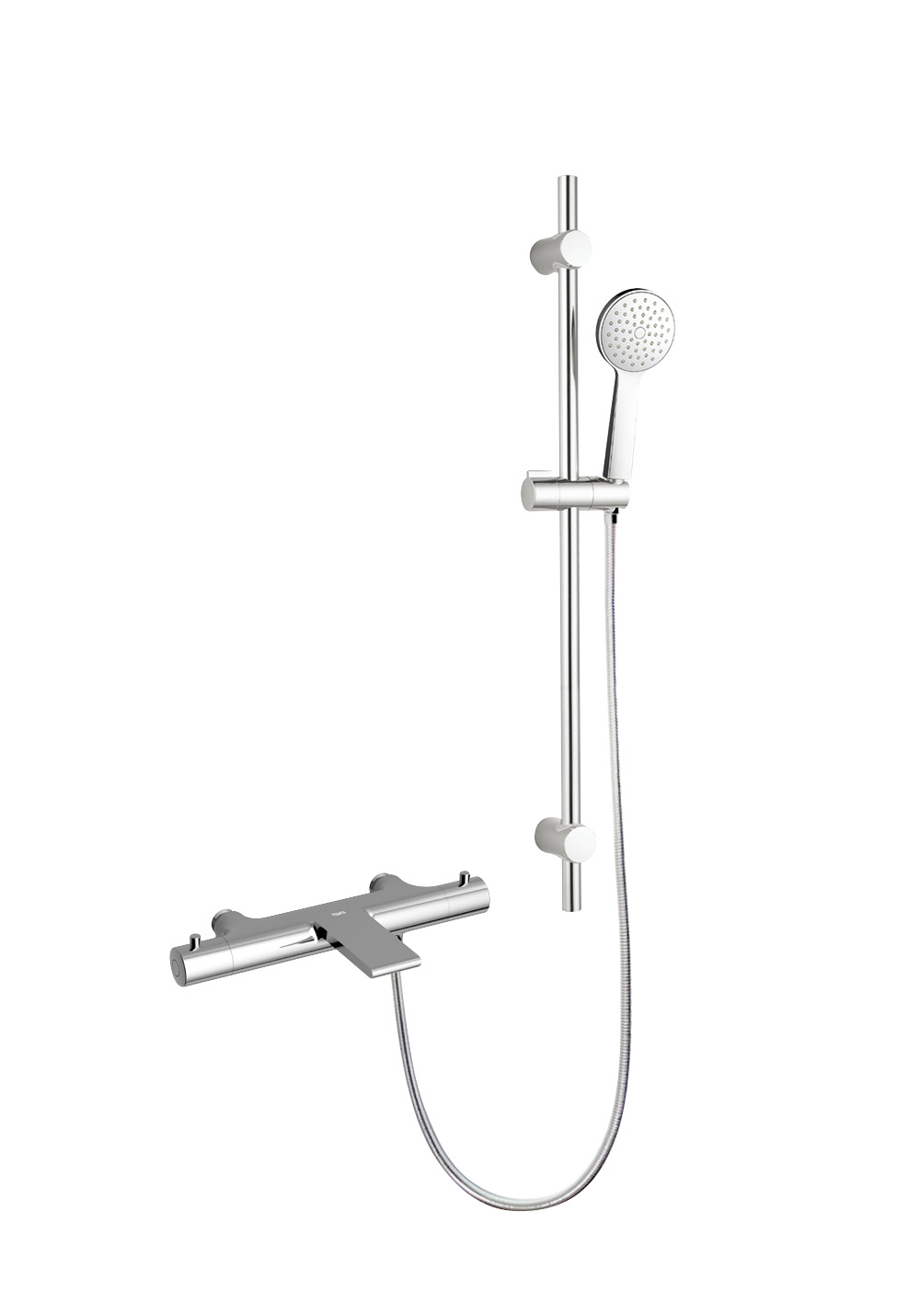 Duschset Gaia med badkarsblandare Tide. Duschhandtag med Water Save och duschslang med AntiTwist. Gedigen termostatblandare av mässing med skållningsspärr och HeatProtection och badkarspip. Duschblandaren är testad och certifierad av SINTEF.
