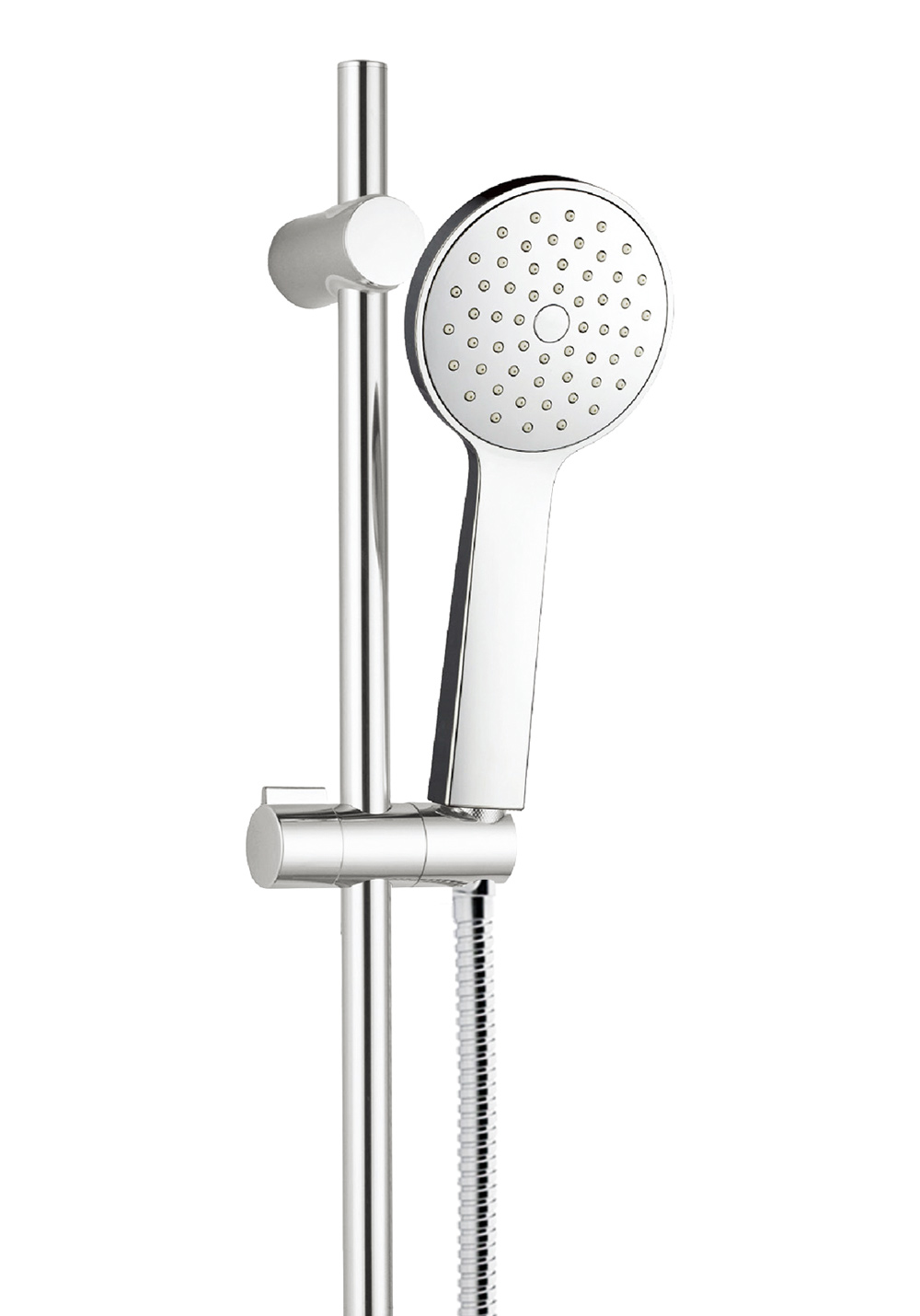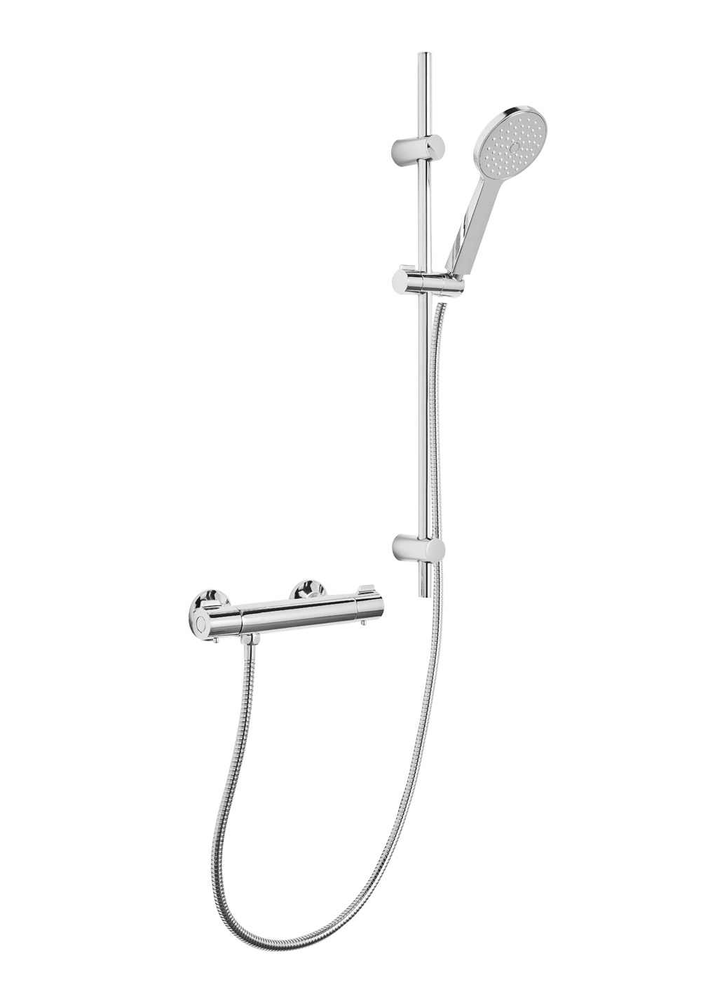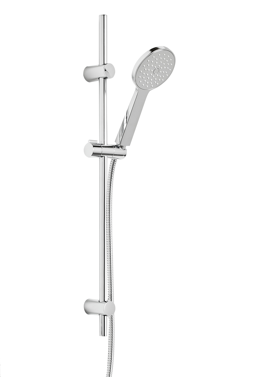 Smidigt och stilrent duschset i krom med duschstång av rostfritt stål och duschslang i rostfritt stål med AntiTwist. Greppvänligt smäckert duschhandtag med Water Save. Duschstång med justerbara väggfästen 350-575 mm.